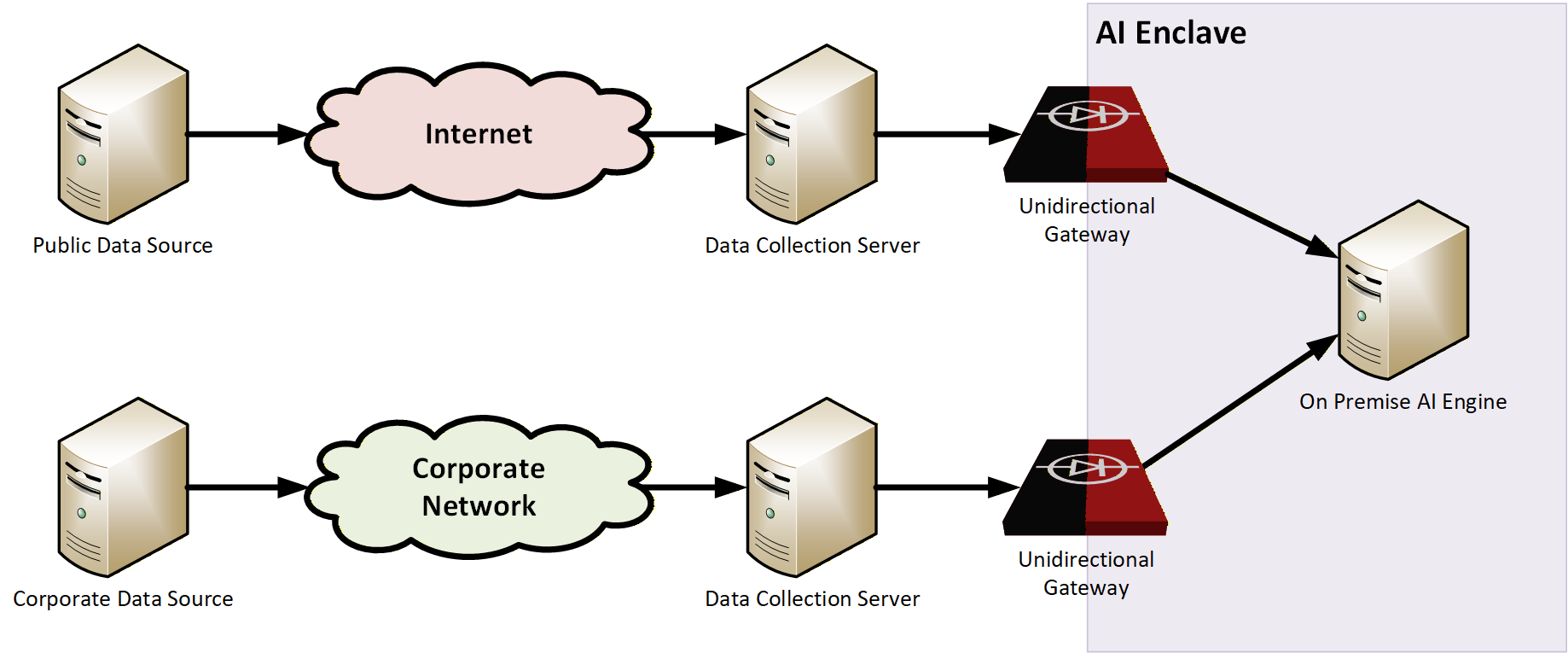 A secure AI enclave, protected with a unidirectional gateway, allows organizations to harness the power of on-prem AI while ensuring that sensitive models and datasets never leave a trusted boundary. By isolating workloads in a hardened environment, the enclave provides confidentiality for training data, integrity for model development, and controlled availability of outputs.